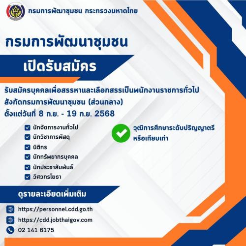 ✨กรมการพัฒนาชุมชน เปิดรับสมัครบุคคลเพื่อสรรหาและเลือกสรรเป็นพนักงานราชการทั่วไป สังกัดกรมการพัฒนาชุมชน (ส่วนกลาง)